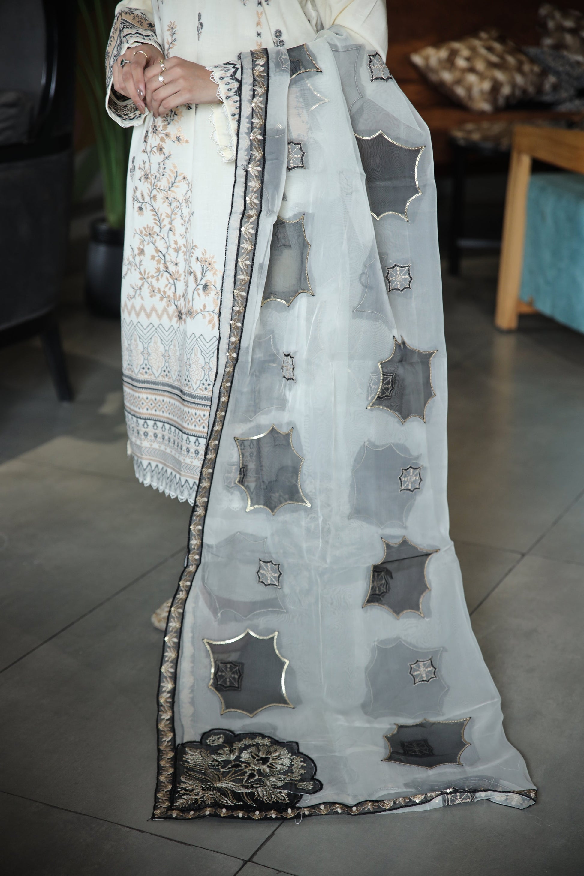 Elevate your style with our three-piece brosha lawn, featuring self print brosha shirt with lace, paired with plain trouser and organza dupatta.