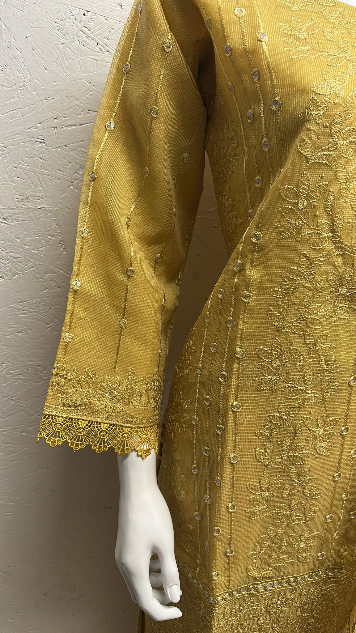 Premium quality net shirt with sleeve. Heavy embriodery on shirt and embrioded sleeve with lace. Beautiful neck design and 2-inch border on front and back.